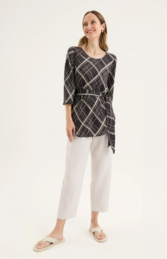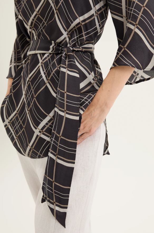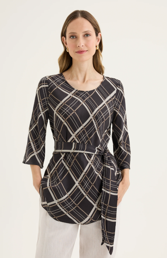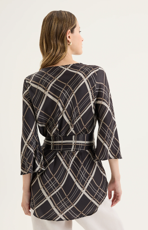 The Controllo Top reimagines a wardrobe basic with elevated detail and a statement silhouette. Crafted in an exclusive print, it features a soft round neckline, curved hem, and sculptural ¾ bell sleeves that bring movement and volume. The self-fabric waist tie threads through subtle belt loops to create gentle definition through the waist, offering a cinched shape that flatters without restricting. Falling to the lower hip, it’s a versatile piece that adds polish to everyday outfitting while remaining easy to wear.