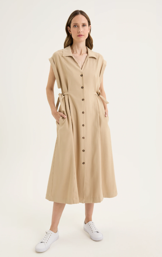 Crafted from breathable viscose, the Desert Shirt Dress offers a refined balance of structure and ease for the warmer months. The two-way adjustable collar and button-through placket allow for versatile styling, while the extended short sleeves with wide hem bands bring a polished finish that appears almost sleeveless. Practicality is woven into the design of this dress, with functional inseam pockets and discreet side-waist ties that can be adjusted to define the shape or left loose for a more relaxed silhouette. Falling to mid-calf midi length, it’s a dress that transitions seamlessly from workdays to weekend escapes. Timeless, versatile, and thoughtfully detailed, this is a wardrobe investment piece you’ll return to season after season.