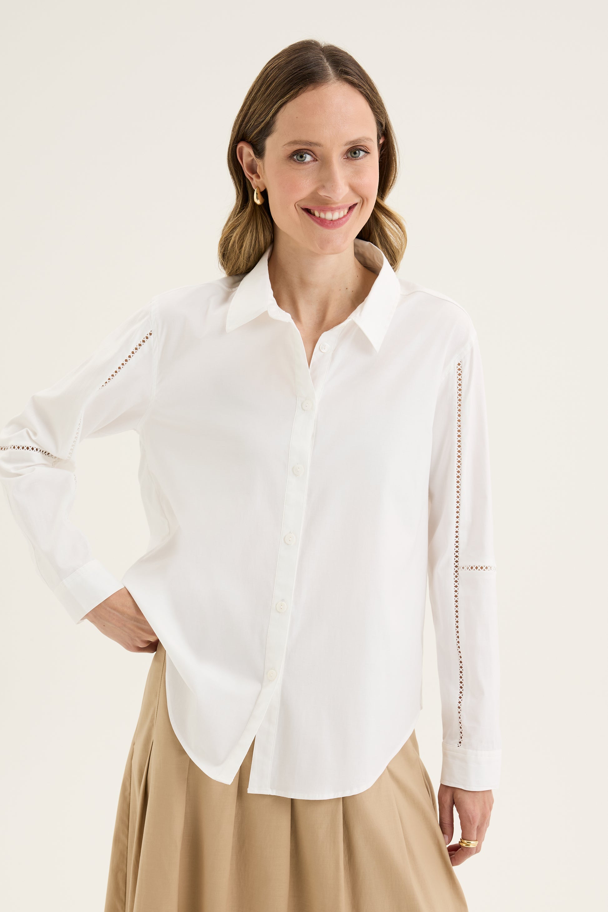 The Pedirika Shirt elevates a timeless classic with considered detail. Crafted from a breathable cotton-elastane blend, it offers the crisp look of a white shirt with the added comfort of gentle stretch. Ladder lace trim along the sleeves introduces subtle texture, while the curved hem, back yoke, and relaxed fit ensure it drapes with ease. Finished with a full button-through placket and a neat shirt collar, it’s a versatile wardrobe staple - perfect for layering under knitwear, pairing with tailored pants, or wearing untucked for effortless summer polish.